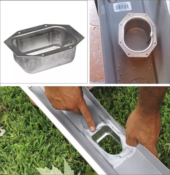 2、 把槽管連接器套在出水口上,與檐溝鉚接在一起。